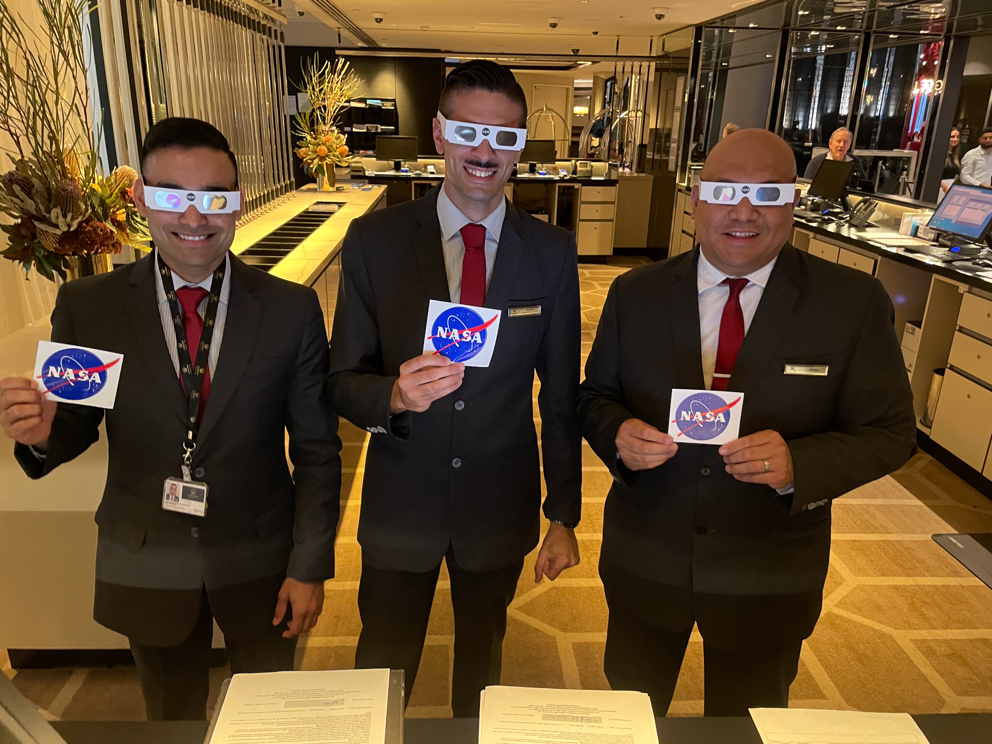 | The staff at our hotel is READY TO OBSERVE THE SUN! NASA's Heliophysics Division sent me a huge box of glasses + sitckers before I headed down, and I used them all. |