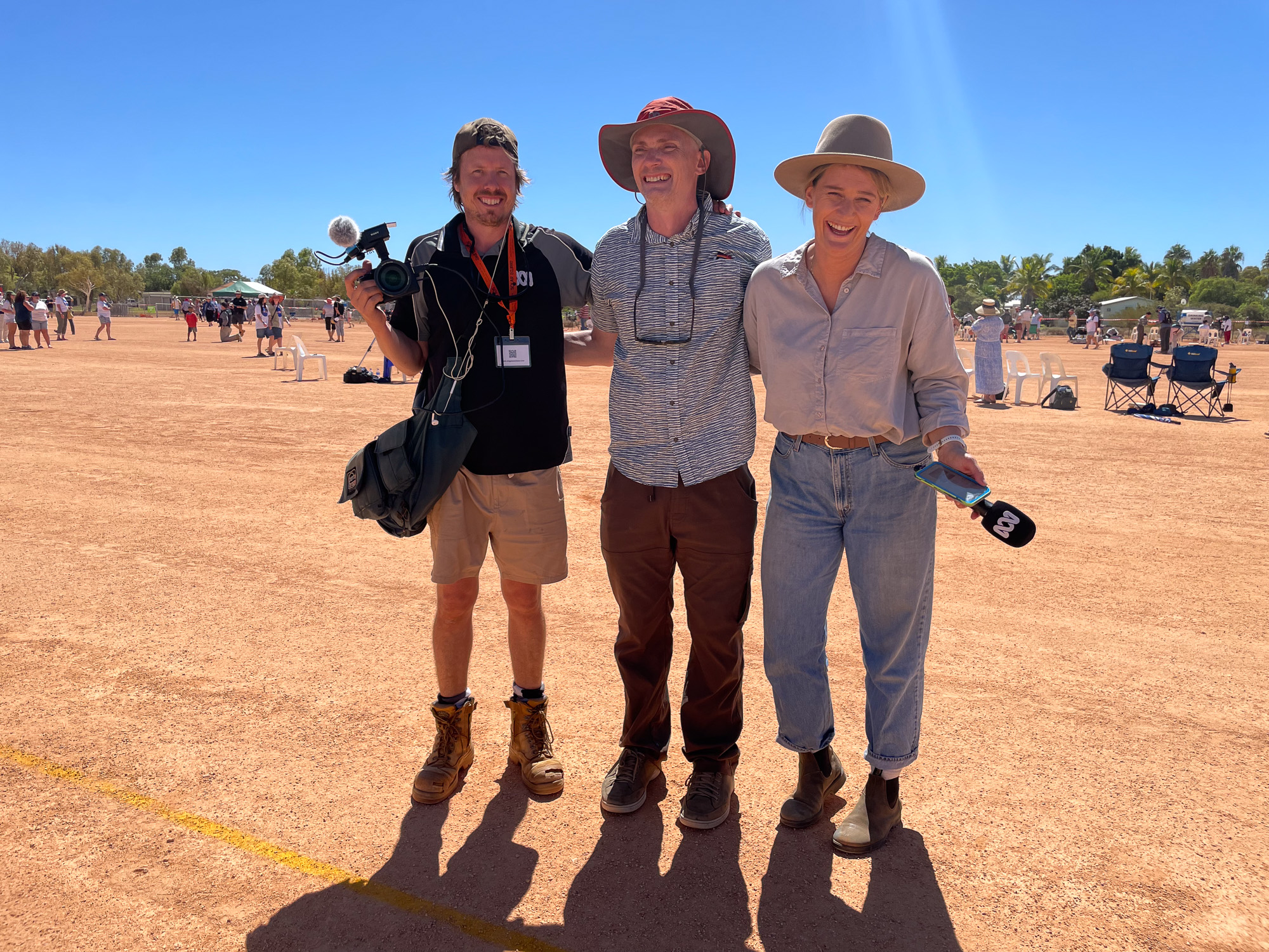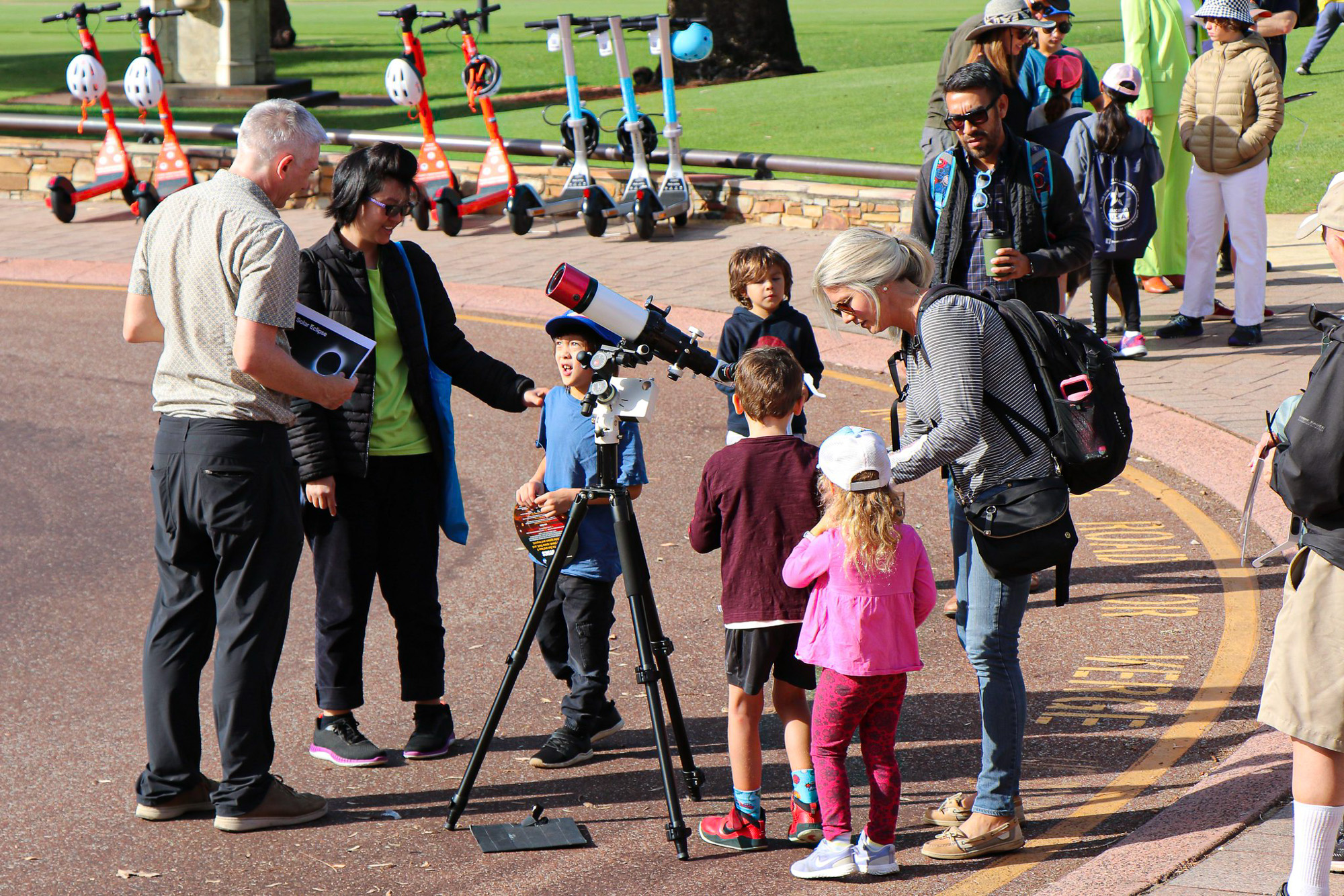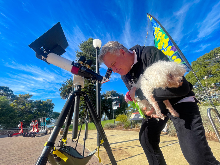 | TV crews filming at the star-party in Perth. This student is looking at the sun in H-alpha, through one of the Lunt solar telescops I've brought. |