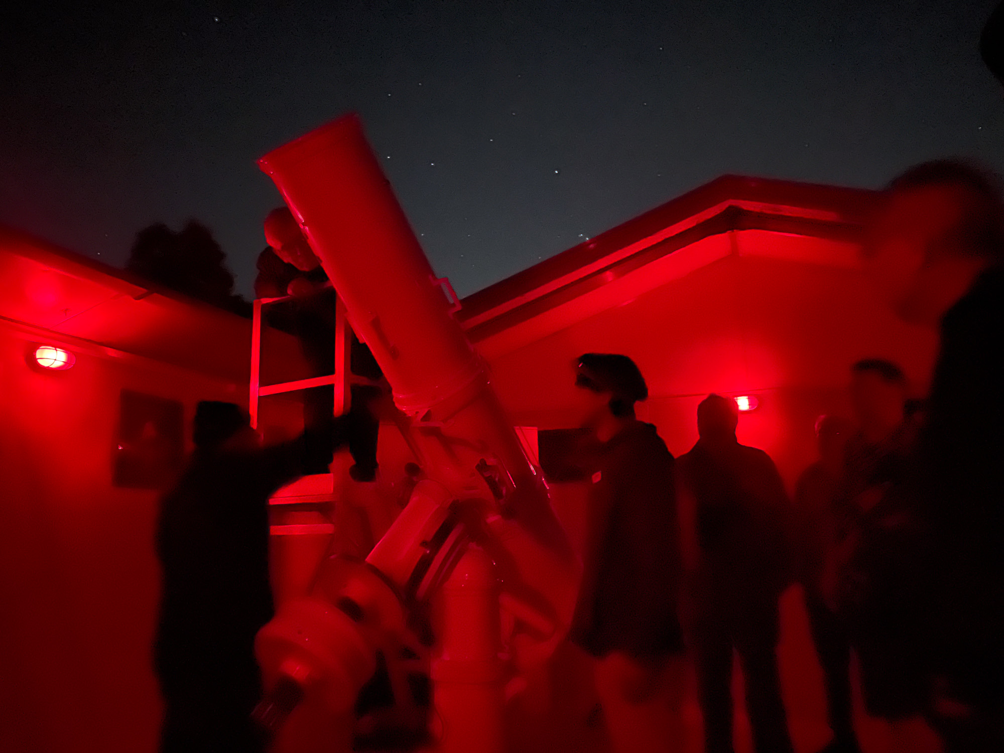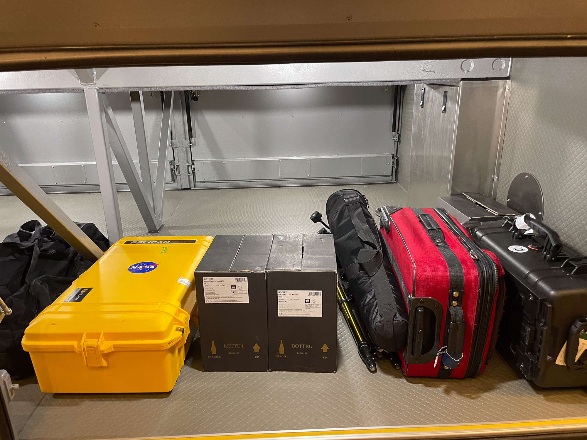 | Check out that checked luggage: telescopes, tripods, and champagne! |