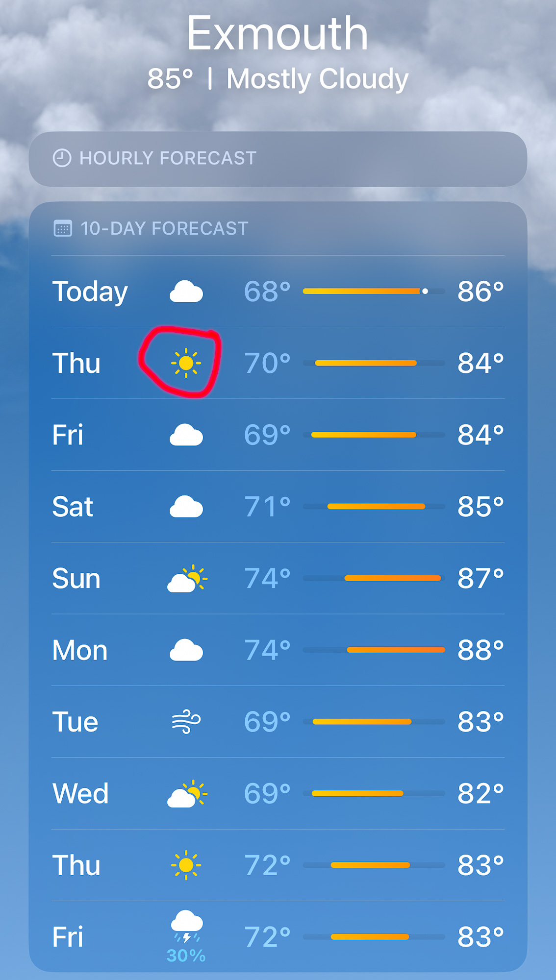 | Eclipse day!! The weather for Thursday looks fantastic. A week earlier Exmouth and northern Australia had a typhoon hit which caused a lot of bad weather, but that has mostly dissipated by now. |