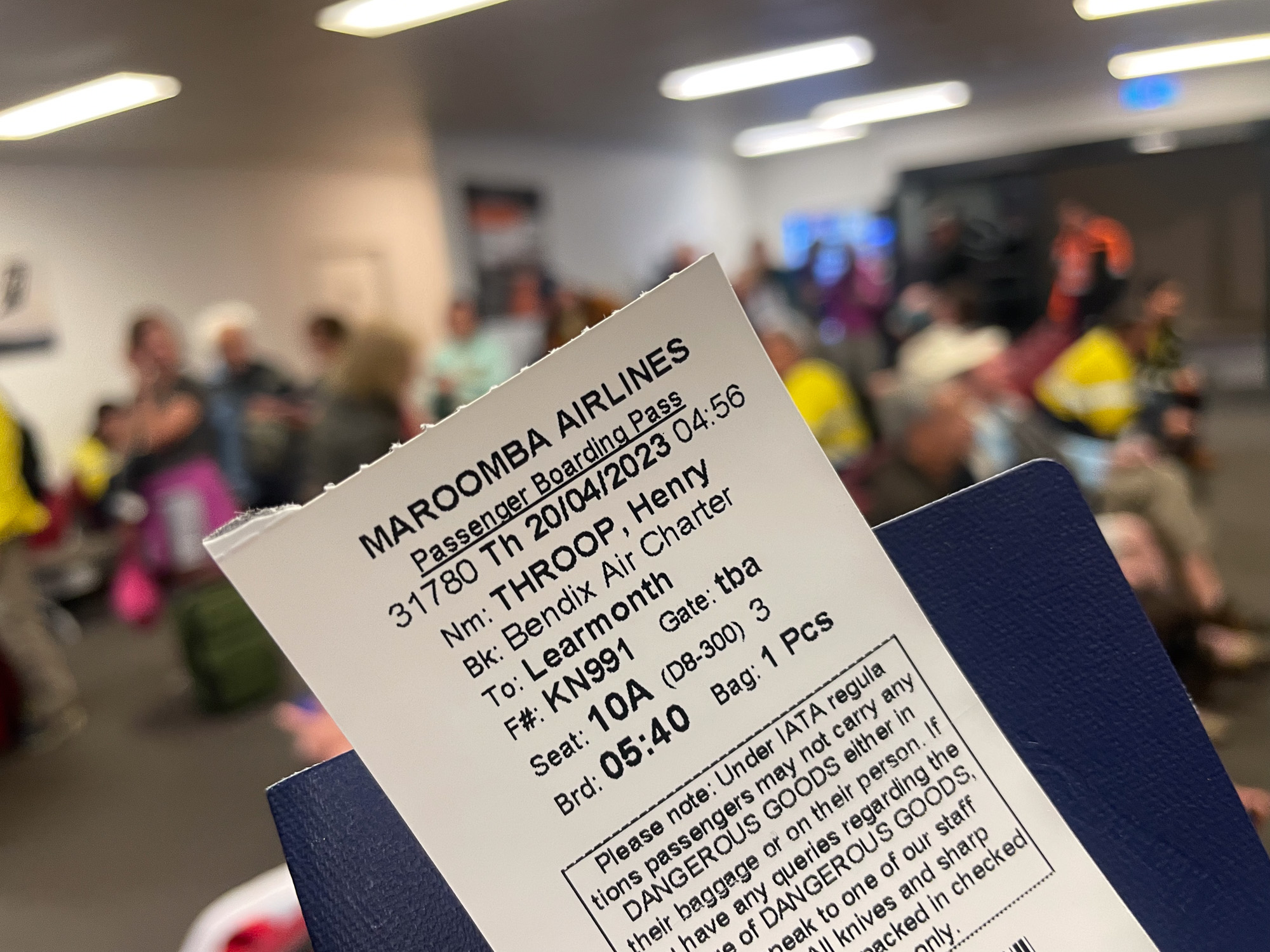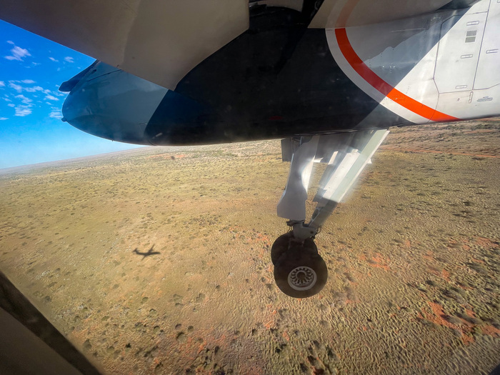 | Heading back to Perth! An hour earlier, we were told to stay inside because of a dangerous snake that had been seen. But now our plane is here, and the snake is gone, so goodbye Exmouth! |