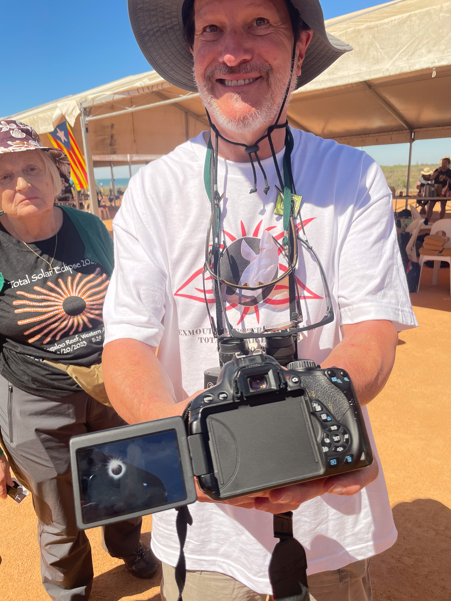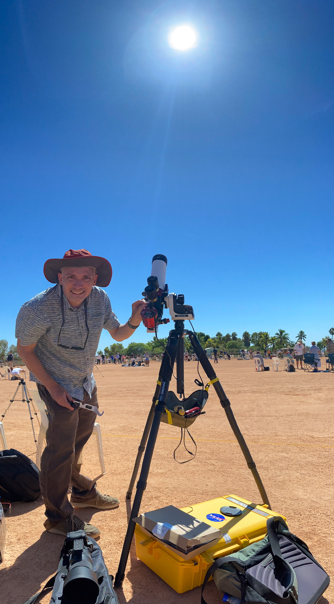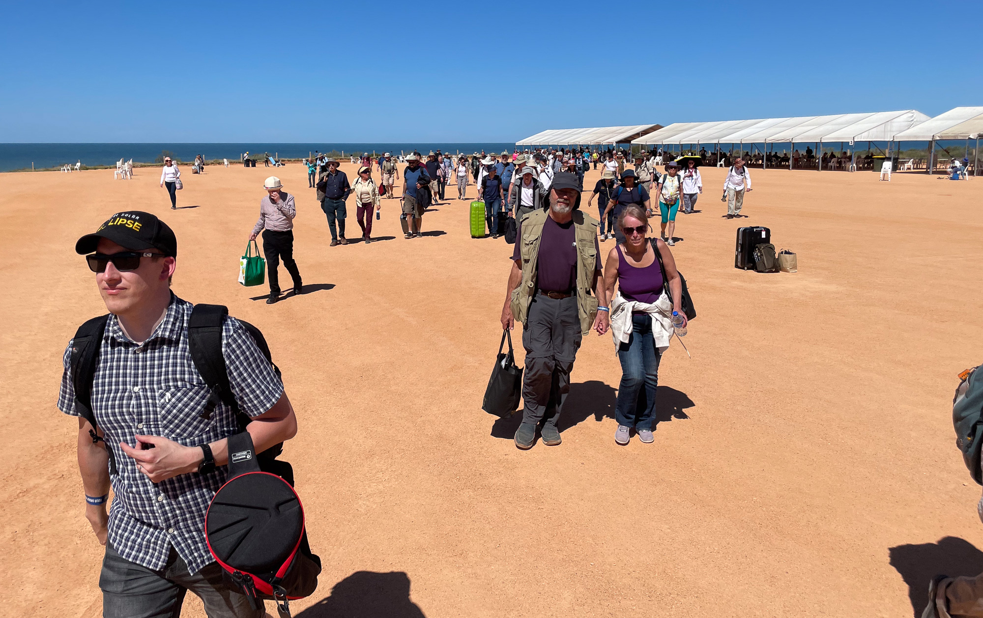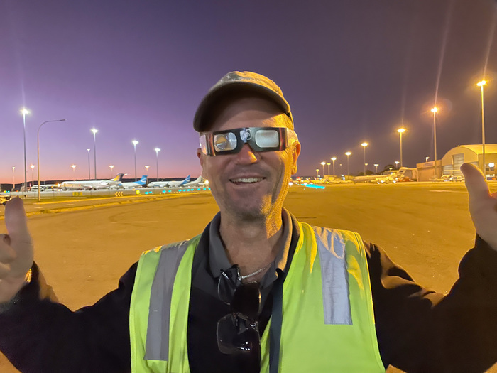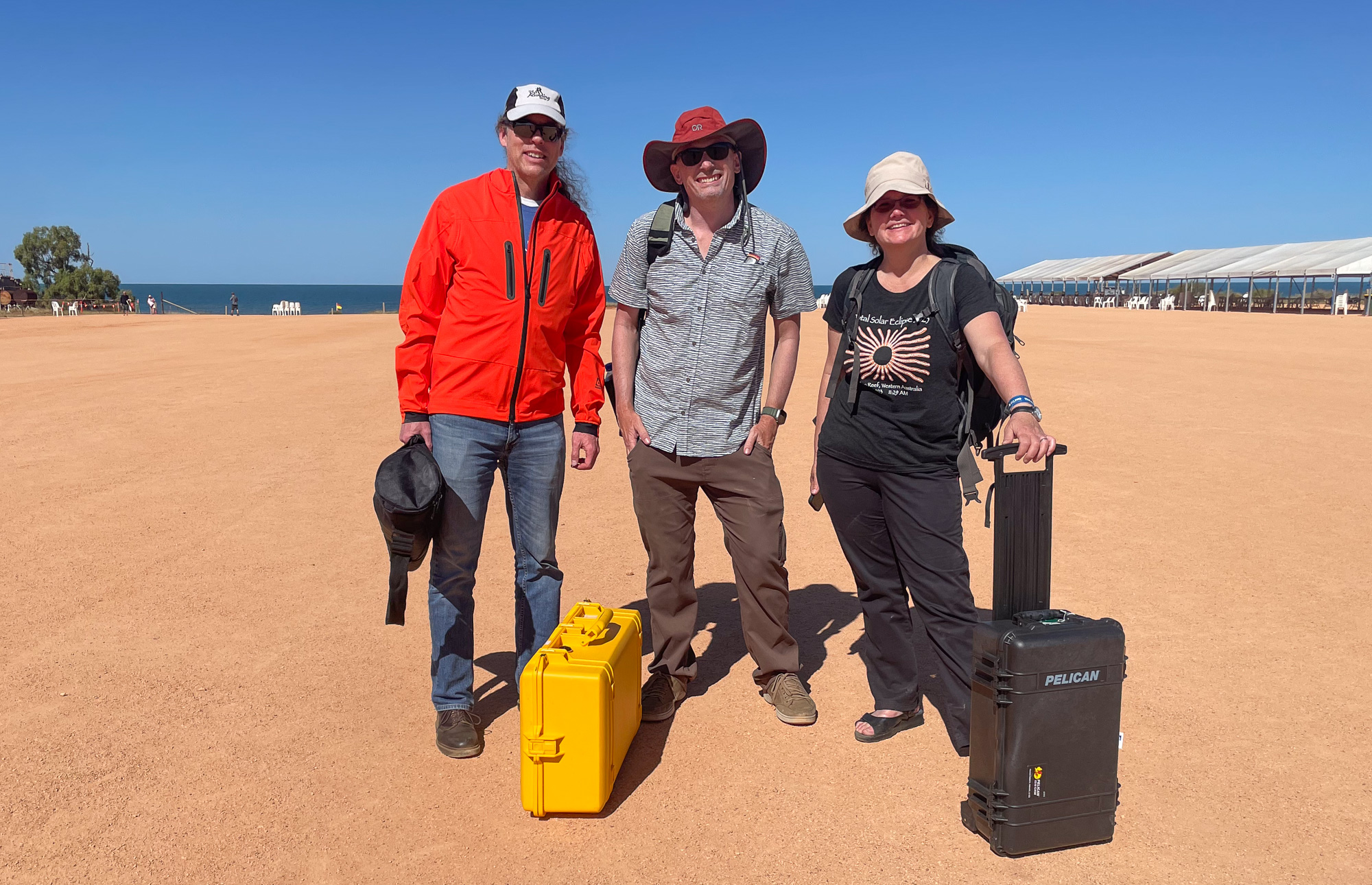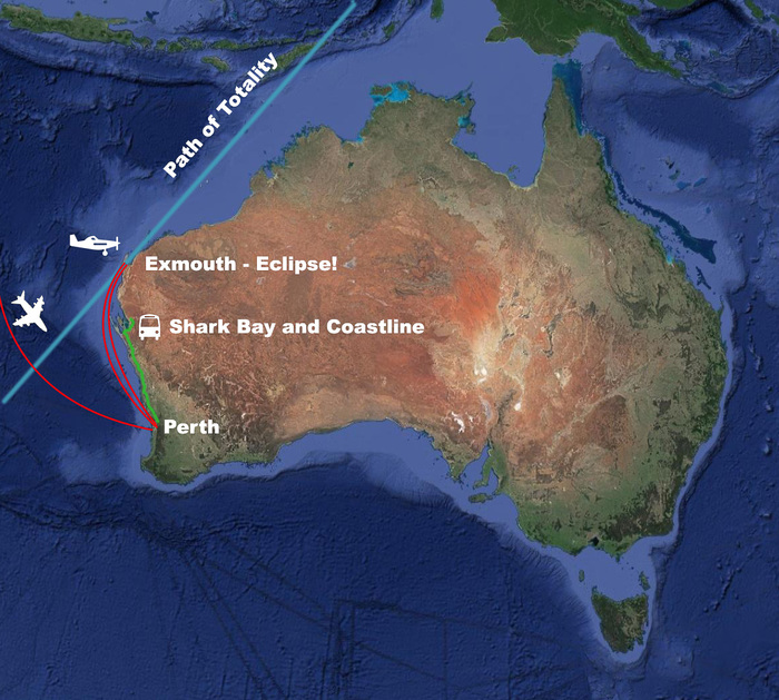 This eclipse was unique for a couple of reasons. First, the path of totality was almost completely over water. The path would pass only briefly over land: first in Exmouth, Western Australia, and a few minutes later over Indonesia and East Timor. Given the much better weather odds in Australia, Vicky set up an eclipse trip to Western Australia. But Exmouth is on a tiny, remote peninsula on the far corner of Australia. There is only one legit town there (population 2806), and the closest major city is Perth, 1200 km away. So, this eclipse would be seen only by a very small group of people. It was kind of the opposite of the 2017 USA eclipse, which passed directly over millions of houses across the US. Second, this was a 'hybrid eclipse,' which really just means that it's very short. During some eclipses the moon is slightly closer to us (giving a large moon, and thus a really long eclipse, up to 7 minutes). During other eclipses the moon will be far enough away from us that it doesn't even cover the entire sun -- and thus an 'annular eclipse.' This hybrid eclipse is just at the sweet spot inbetween these: the sun is covered exactly by the moon. That means it's a pretty short eclipse (in this case, barely a minute) -- but it also means that you see more corona, and more solar prominences and/or flares, since the moon isn't blocking them so much.