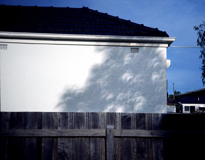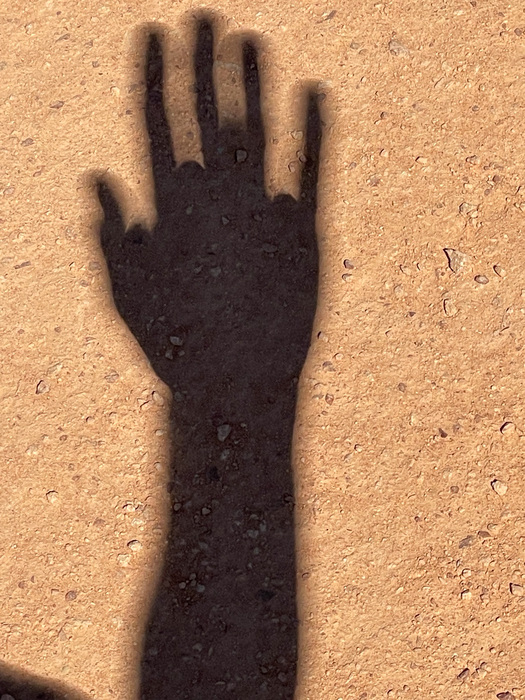 | OK, things are getting weirder. That's the shadow of my hand. The Sun is about 2/3 covered now, so instead of shadows being cast by a round ball, they're made by a long, thin crescent. |