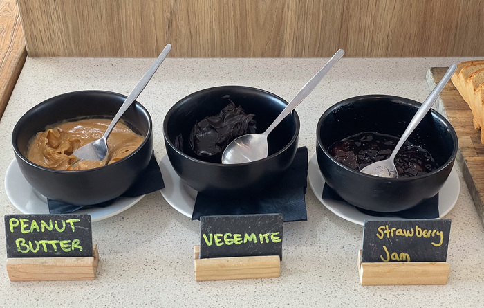 | I guess I always thought that Vegemite was supposed to be used in limited quantities? But this serving arrangement implies that a nice big scoop of it on your toast might really hit the spot. |