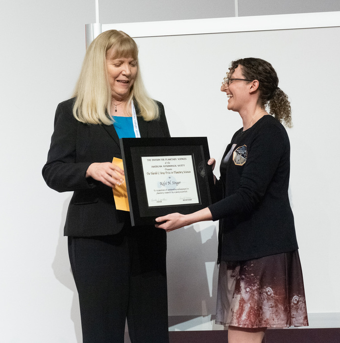 | DPS Chair Linda Spilker with Kelsi Singer (SwRI), 2019 Urey Prize winner |