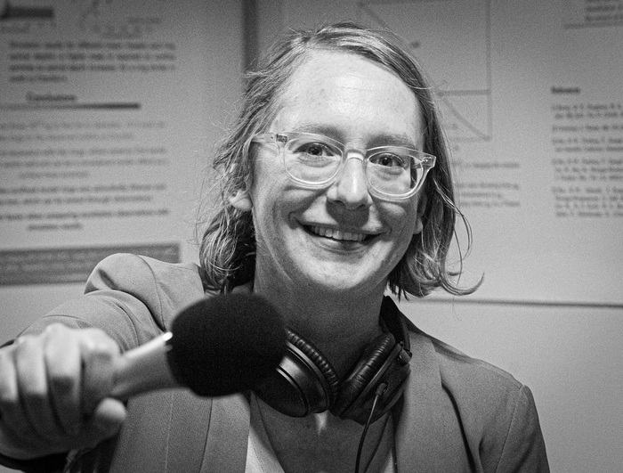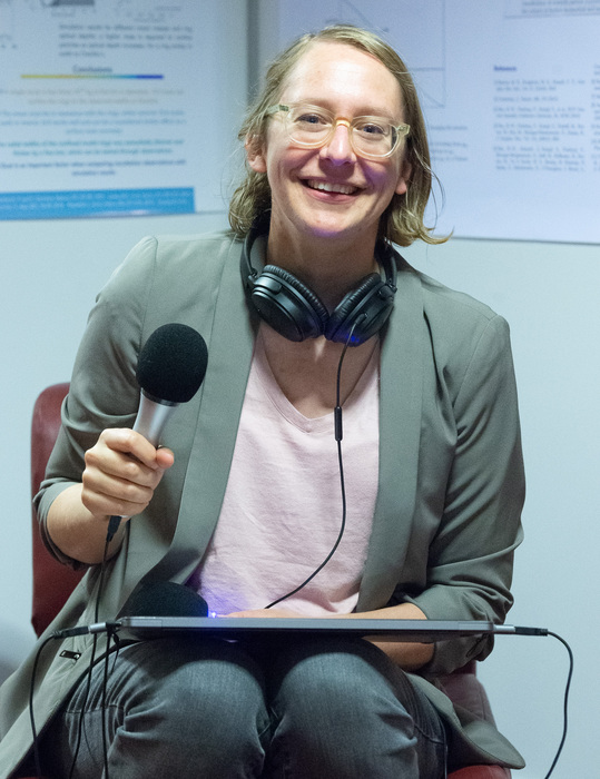 | Not one to miss the chance to interview some great subjects for the Spacepod podcast, Carrie Nugent (Olin College) gets to work in a quiet corner of the poster room. |