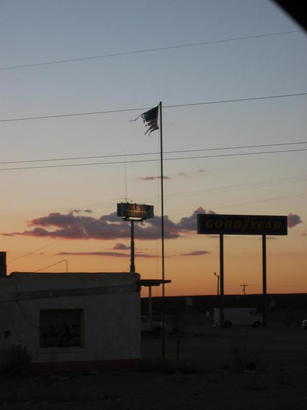 A weather-beaten US flag welcomes us to the I-10's Goodyear Tire Centre.