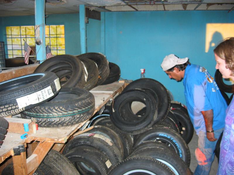 A uniformed crewmember searches for tires through his computerized inventory.