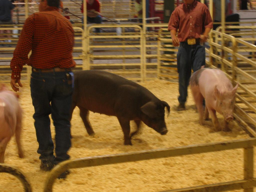 Ten minutes later, most of the pigs have run away from their owners. The champion is the decapitated handler to the right.