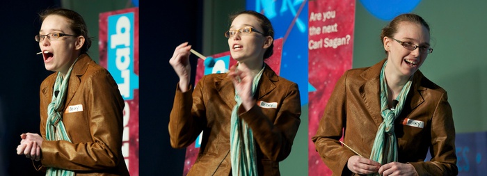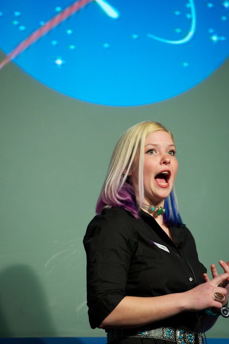 MC's Daniella Scalice and Shawn Domagal-Goldman start off the morning at the James Webb Auditorium at NASA HQ in Washington, DC. |