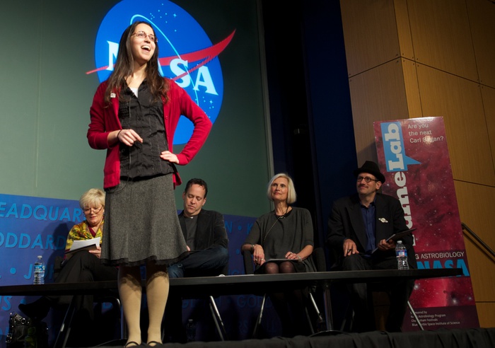 The judging panel at NASA HQ: Nikki Lowry, Bill Margol, Linda Billings, and David Grinspoon. |