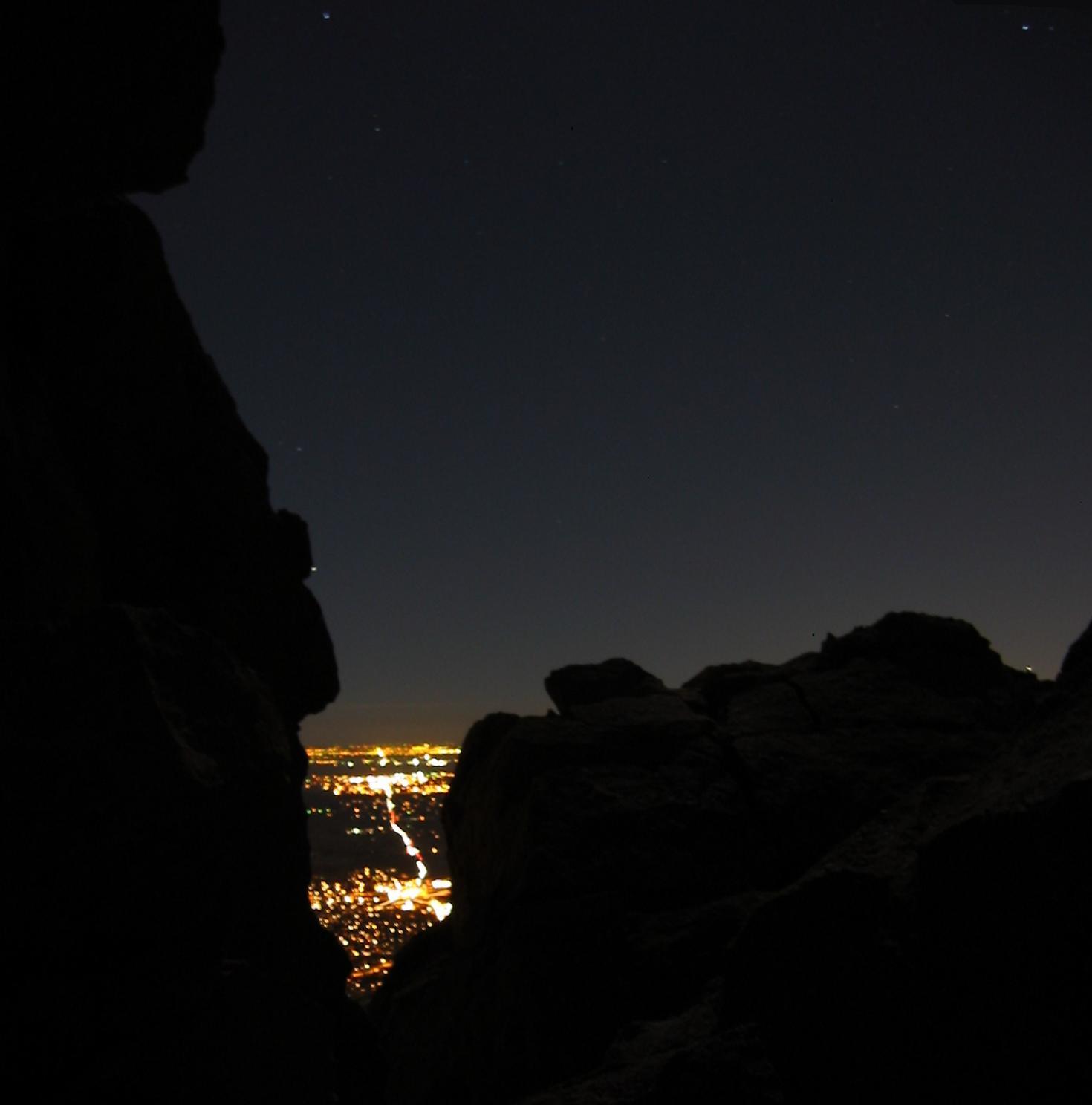 After the first abseil, in the South Bowl. Note Sirius rising on the left, and S. Boulder Rd. in the center.
