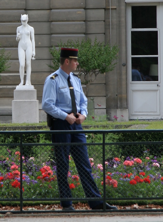 A French guard unsuccessfully protects the modesty of the statue behind him.