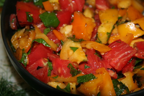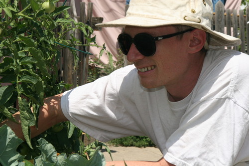 We planted six different kinds of tomatoes from the Farmer's Market: Green/Yellow, Orange, Orange Cherry, Black/Pink, and two Reds. The green ones are real juicy; the pinkish ones are sweet and caramelized. All winners, except for the two reds, each of which are bland tasting and bit visually unexciting to boot. Neither Heidi nor Piper are big tomato fans, so I get them myself.
