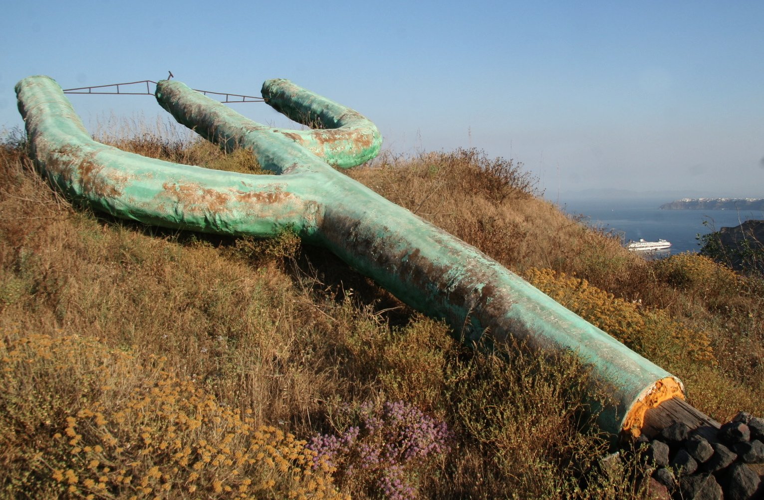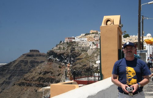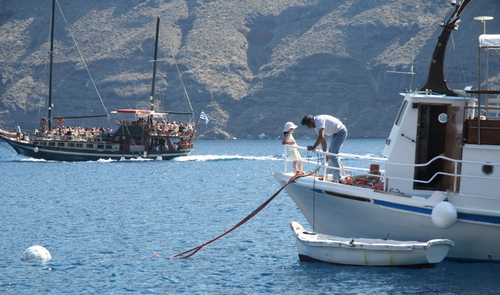 | Riding the device back up the hill to Thira, as the boat departs... |