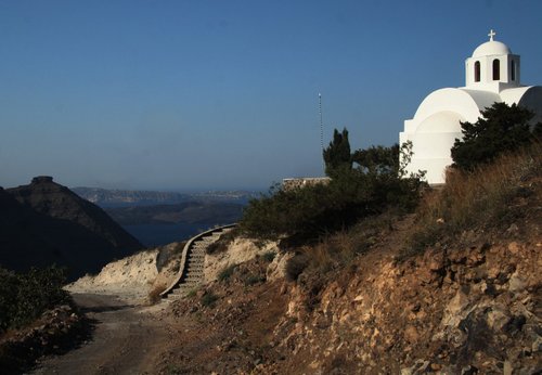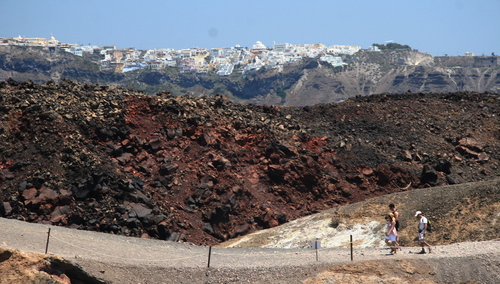 | Hiking up the caldera. There's a high-speed ferry (which runs to Athens) in