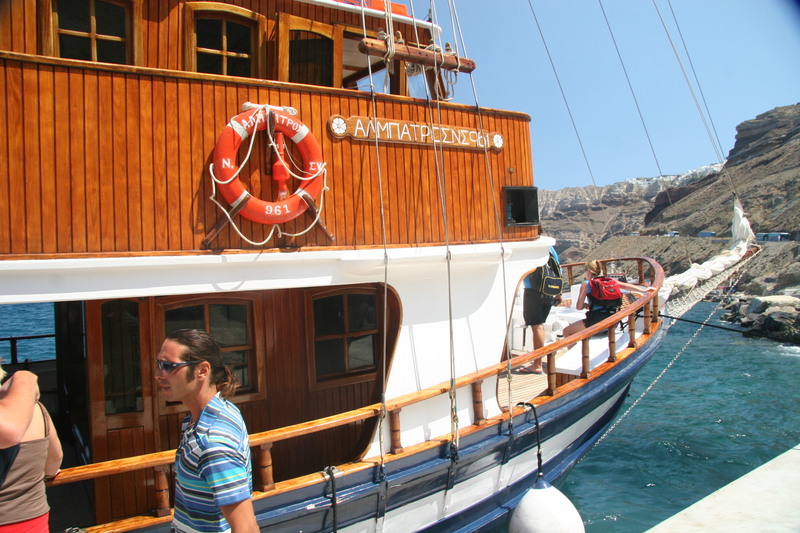 I got on a boat (the ΑΛΜΑΤΡΟΣ = ALBATROSS, if you spell it out...). That's our guide Yannis there. We cruised out to the volcano at the center.