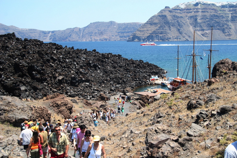 Hiking up the caldera. There's a high-speed ferry (which runs to Athens) in the background.