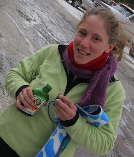 | Steph betrays her Wisconsonian roots at the Breckenridge base, with the cows