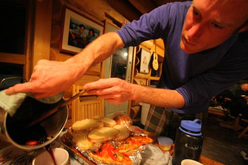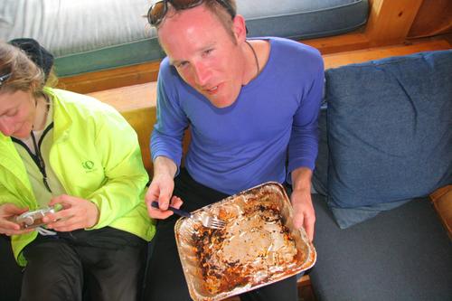 | Dinner 1: garlic bread, mulled wine, and a 9-lb lasagne packed on dry ice. |
