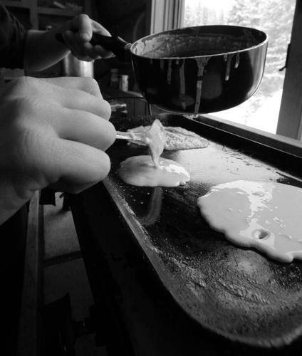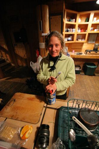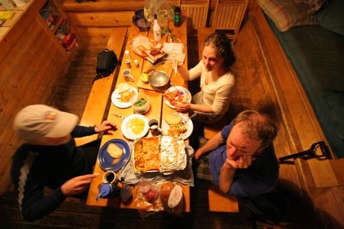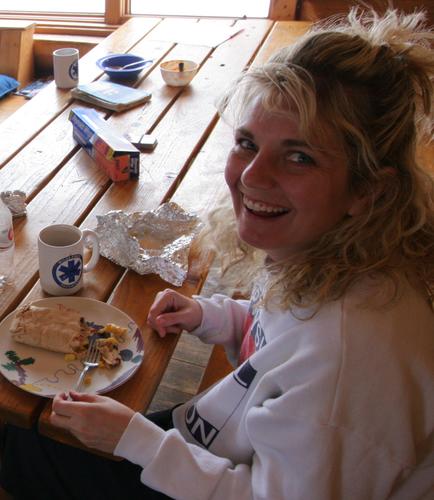 | A person with an unknown name enjoys breakfast after her first hut trip. |