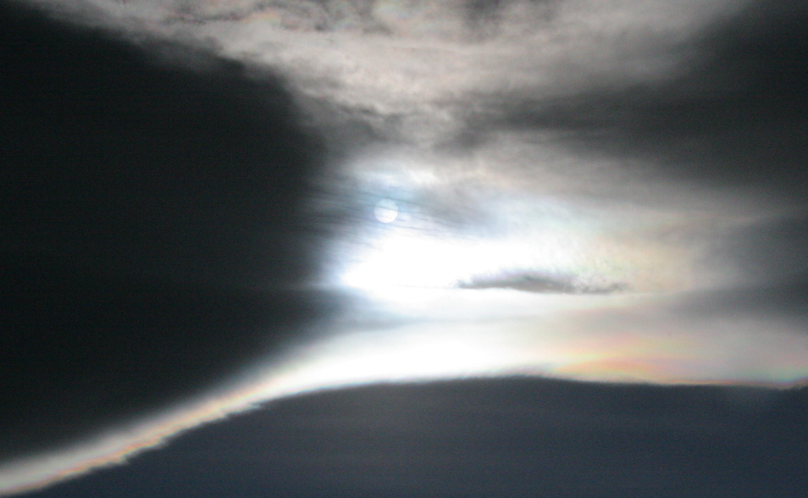 Whoa! That's the sun, behind an icy lenticular cloud that's been following us nearly all the way from Berck to Evergreen. No color enhancement -- that's the real thing.
