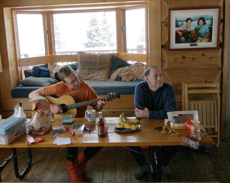 Matt and ? sit at the table, observed by Herb and Francie on the wall. (The hut is named for Francie; the sauna is named after Herb, who died several years later.)