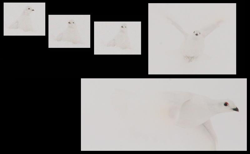 Whoa! OK, so this is the ptarmigan that I apparently skiied right over as I descended. It squawked and ran about 15' once I'd cleared the area. The white-on-white coloring is no doubt of some evolutionary advantage, but it's a hindrance as far as skiier-bird collisions go.