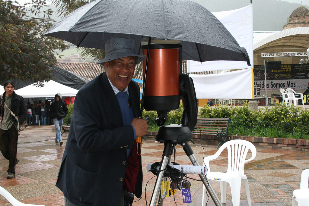 | As we were leaving, Diana sent this photo (which is not us -- it's from an amateur meeting a few years ago). "This shows exactly what Colombian astronomy in the rainy season is like!" (Photo by ASASAC.) |