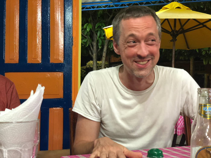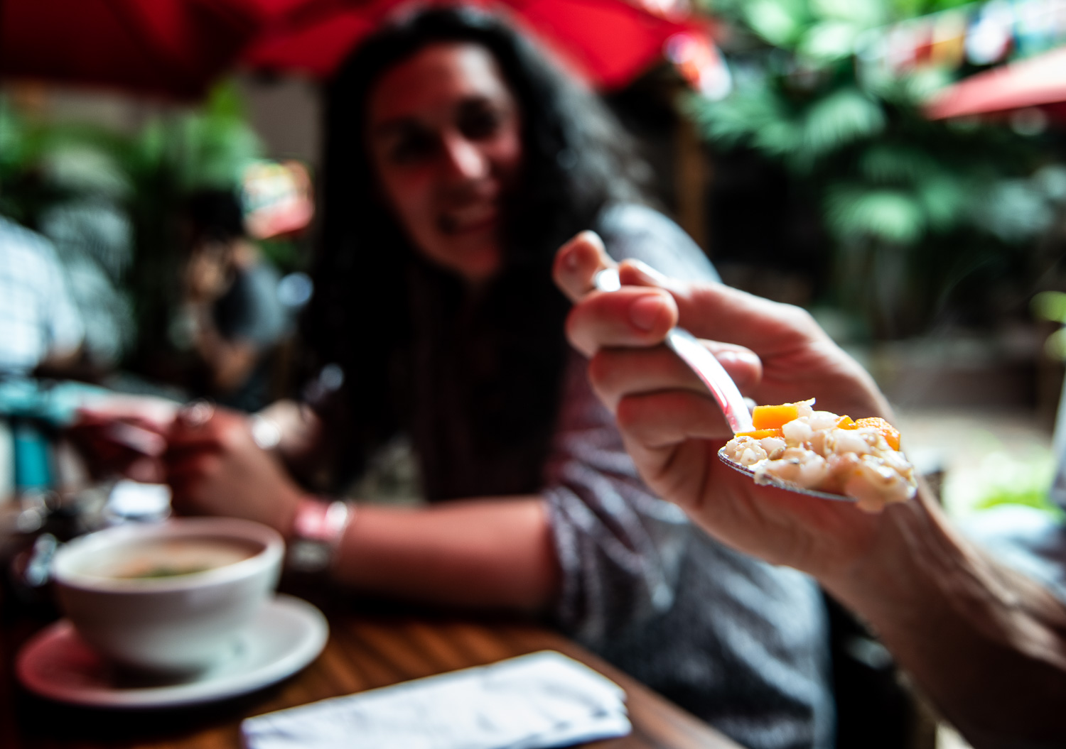 | Diana has caught up with us, and we enjoy another Colombian plato del dia ("Beef or chicken?"). Oh, and some soup! Every classic Colombian meal starts with soup. |
