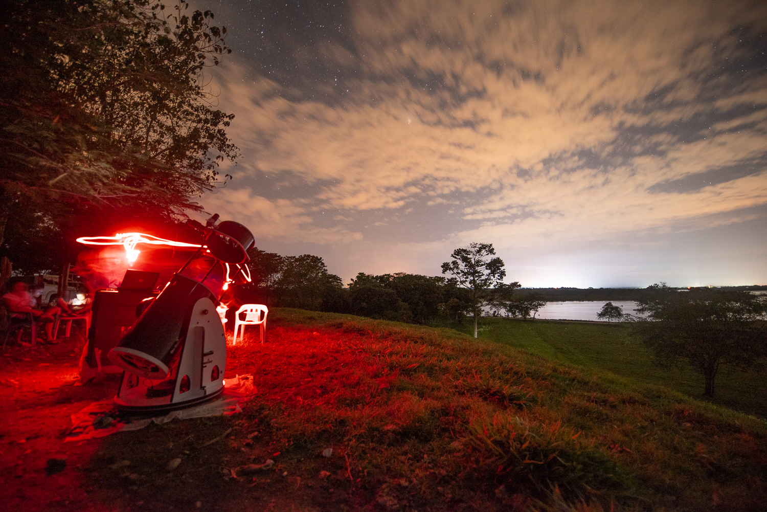 | Kat sets up the telescope. To the right is the beautiful Rio Magdalena. And the glow just above the river? That's not city lights, but lightning starting to move in. |