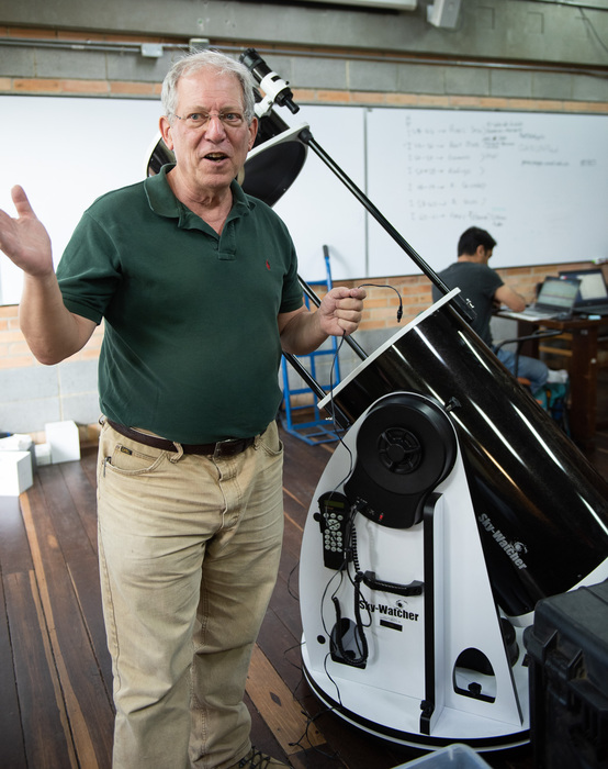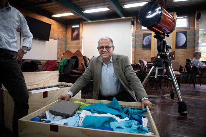 | Alfonso Caycedo runs the Collegio Abraham Maslow that has sent the telescope. "Oh look -- it's nothing but clothes inside!" (But dig deeper and he'll find a mount in that box.) |