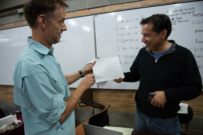 | Rodrigo, Giovanni Gonzalez, Alfonso Caycedo, and an interested passerby (a U Nacional pharmacy student) check out the CCD images of the field. |