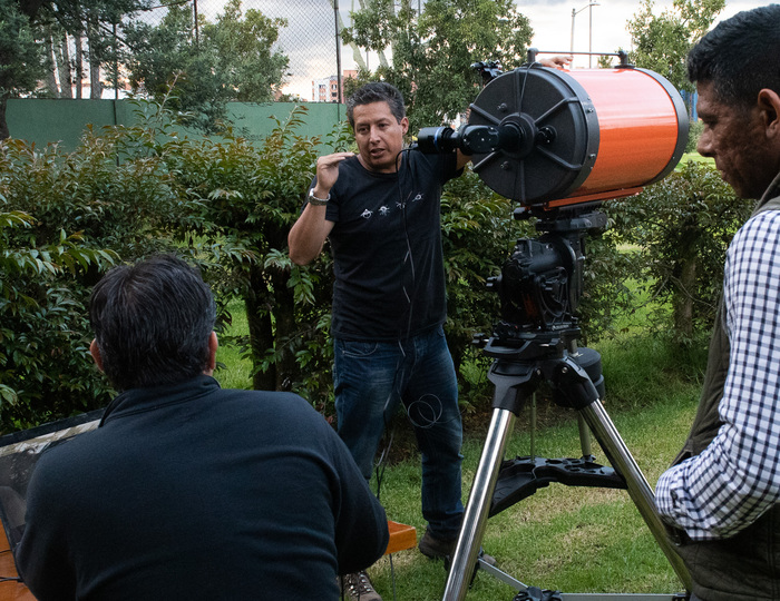 | Karina Sepulveda is aligning at the finder, as everyone watches from the laptop. From left: Adolfo Viana (ASASAC), Kay Getrost, Francisco Tamayo (sitting), Raul Joya, Giovanni ___, and ___. |