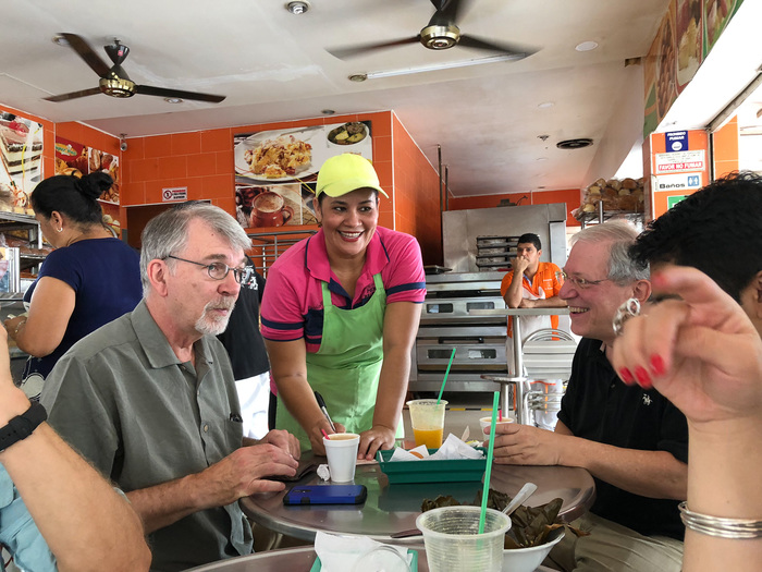 | Our daily morning breakfast at a different local bakery: huevos, tamales, arepas, and a lot of fresh juice. |