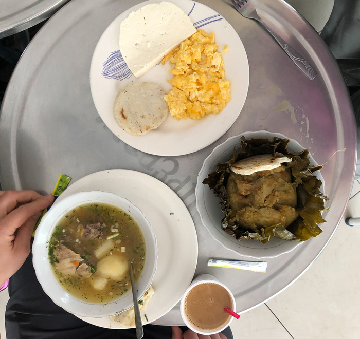 | And more breakfast: soup (with potatoes and meat), a huge tamale, and eggs and arepas with fresh cheese. And coffee! |