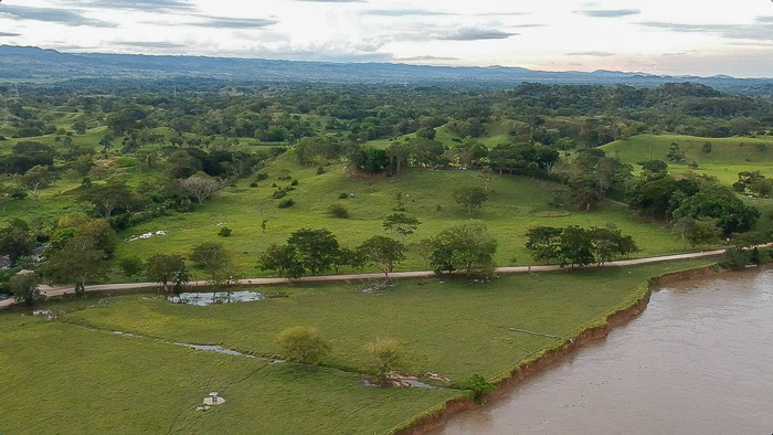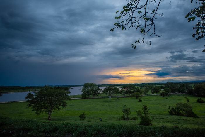 | We keep poking around, and find a few moderately OK sites, though nothing great. But we have the full day for scouting, so I suggest we head to the other side of the river. It turns out to be a long way: the river is wide and fast, so there are not many bridges on it, and there's a lot of back-tracking to get across. Once we do so, we hit a gravel road, and then we start heading through the land of oil derricks. It was looking pretty bad, but we didn't have a better plan so we continued on the road and hoped for the best. Interestingly, Kai realized later that Pablo Escobar's main residence -- Hacienda Napoles -- was just a few kilometers from here. He left a cadre of hippos and other animals, and it has now been turned into a state-run water park. |