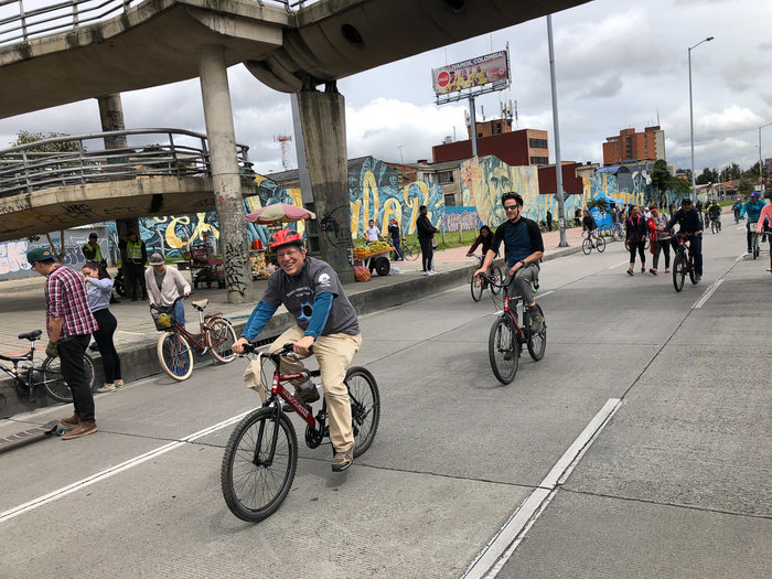 | And then... back to Bogota. We drive back on Saturday, and then have Sunday free. I'd heard for years about the city's Ciclovia, where Bogota shuts down some 100 km of roads every Sunday, open only for cycling. (Mexico City did a very similar Cicloton every Sunday, whiech we often rode when we lived there.) Kai, Ted, and I rent bikes and head out. Paula of Biking Bogota has set us up with bikes and a map. |