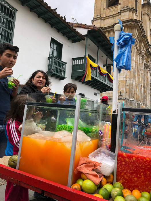 | Kai and I wander around downtown, in the Candelaria historic area. I eat everything I can buy, including this concotion of green mangos and lime. |