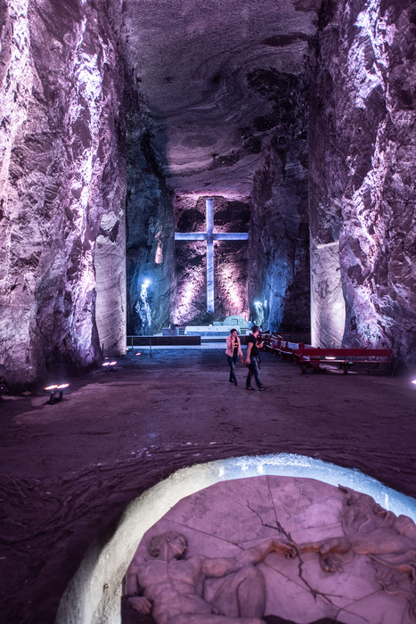 | It's all carved from natural halite, the seams of which you can see in the walls and ceiling. Not surprisingly, it hosts the world's largest underground crucifix. |