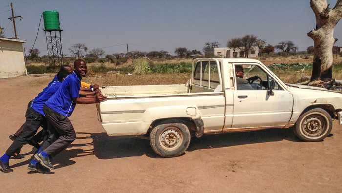 | Pushing the truck back to the school! I think it has no starter, so it always a requires a push to get it started. |