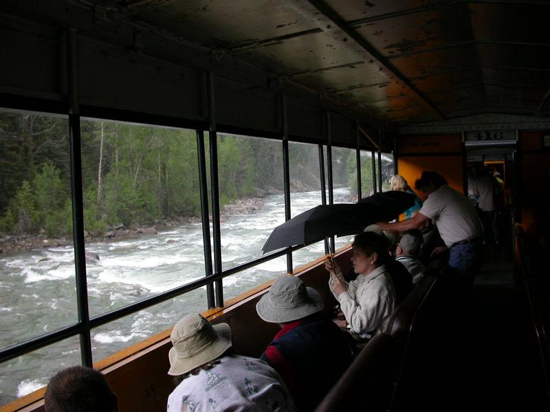 Patrons of the Durango-Silverton Narrow Gauge Railroad compare the efficacies of umbrellas vs. hats while sitting in a fully-covered gondola.