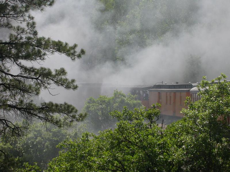 Passengers inhale the classic coal fumes of old-time train travel. (NB: the fireman of this train -- a retired mechanic from Delta Airlines -- shovels 6 tons of coal on the 100-mile round-trip journey. Maximum speed of the train is 18 mph. Tracks were built in the 1880's; locomotives are from the 1920's.)