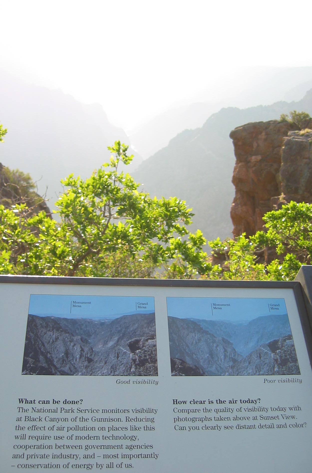 The `haziness index' is off the scale (relative to the two photos below). However, this is due not to increased pollution (*), but mostly to the fact that the Park Service's photos are not calibrated for time-of-day, and that they thus implicitly assume all scattering to be due to Rayleigh particles. This assumption breaks down near dawn & dusk, where the observed phase angle can approach 180 degrees. I am an expert in this are of light-scattering, and I recommend they read my paper on light scattering by small particles in Jupiter's ring for tips on how to properly interpret their images.