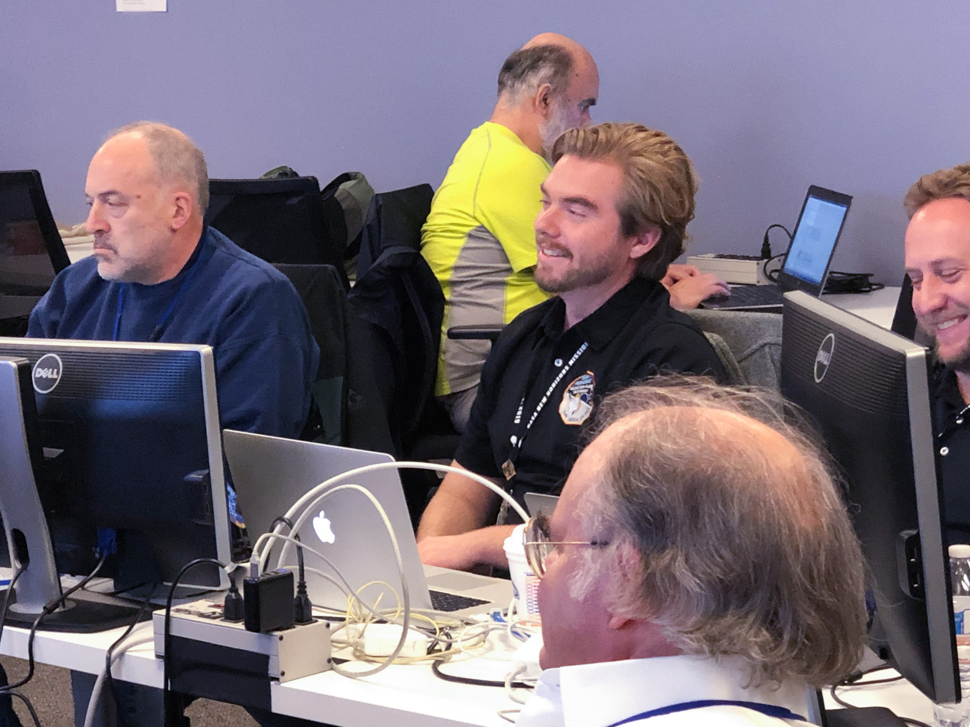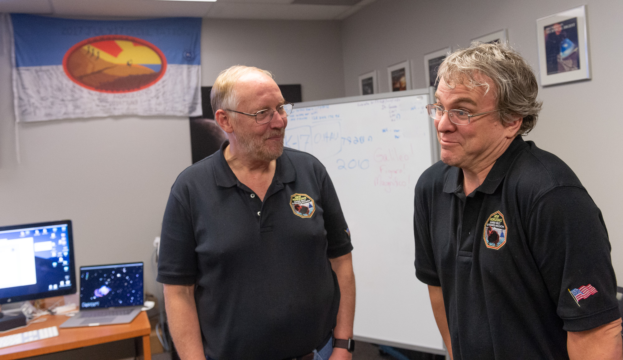 | Mark Showalter, Doug Hamilton, and David Kaufmann. Behind them is the signed flag from the summer 2017 MU69 occultation campaign to Comodoro, Argentina. We're at K-31d. |