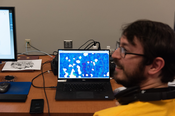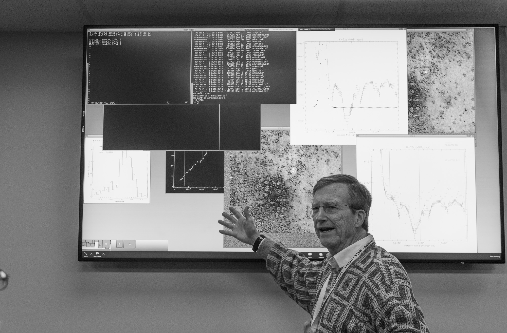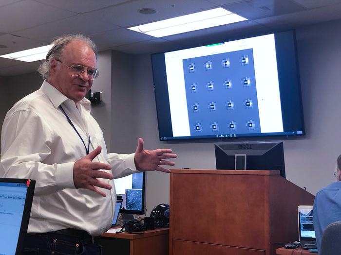 | Hal Weaver checks out some of Marc Buie's flattened image stacks (center bottom) and radial profiles (two white plots). |