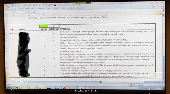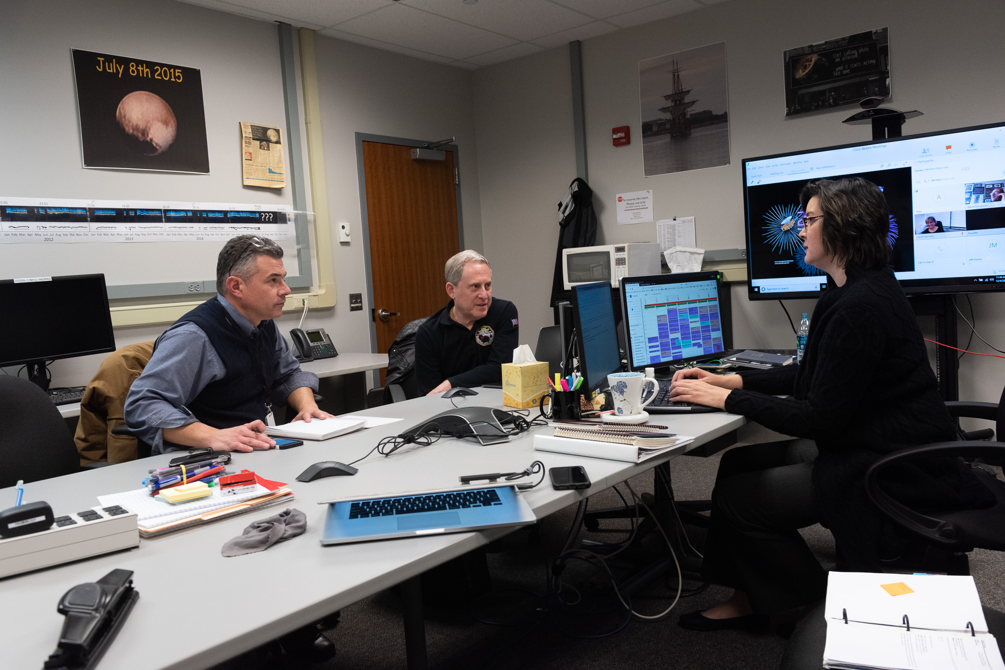 For 17 days we worked in a single room together at the Johns Hopkins Applied Physics Lab (APL), outside Laurel, MD. The culmination of this work was a decision made with the spacecraft 'stakeholders' (i.e., PI Alan Stern, managers, and engineers), where they chose whether to fly the Prime trajectory, or the Alternate.