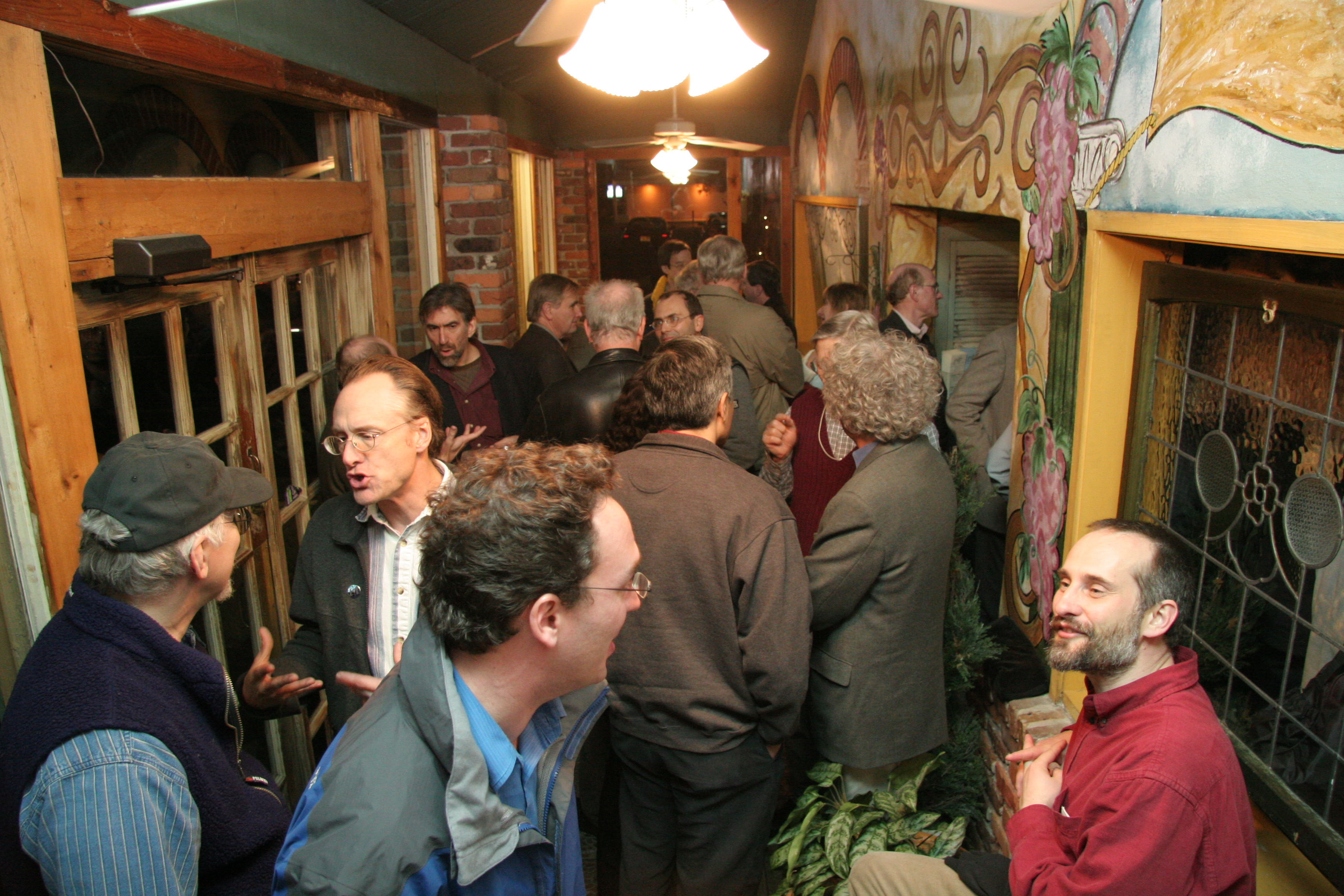 | 50+ science team personnel mob the lobby of the restaurant soon after our reservation has been cancelled. |