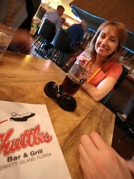 | We repose post-non-launch. Our badges get us a free round courtesy of shuttle HVAC technician Ron who sees us come in. Note the astronaut shots on the back wall. |