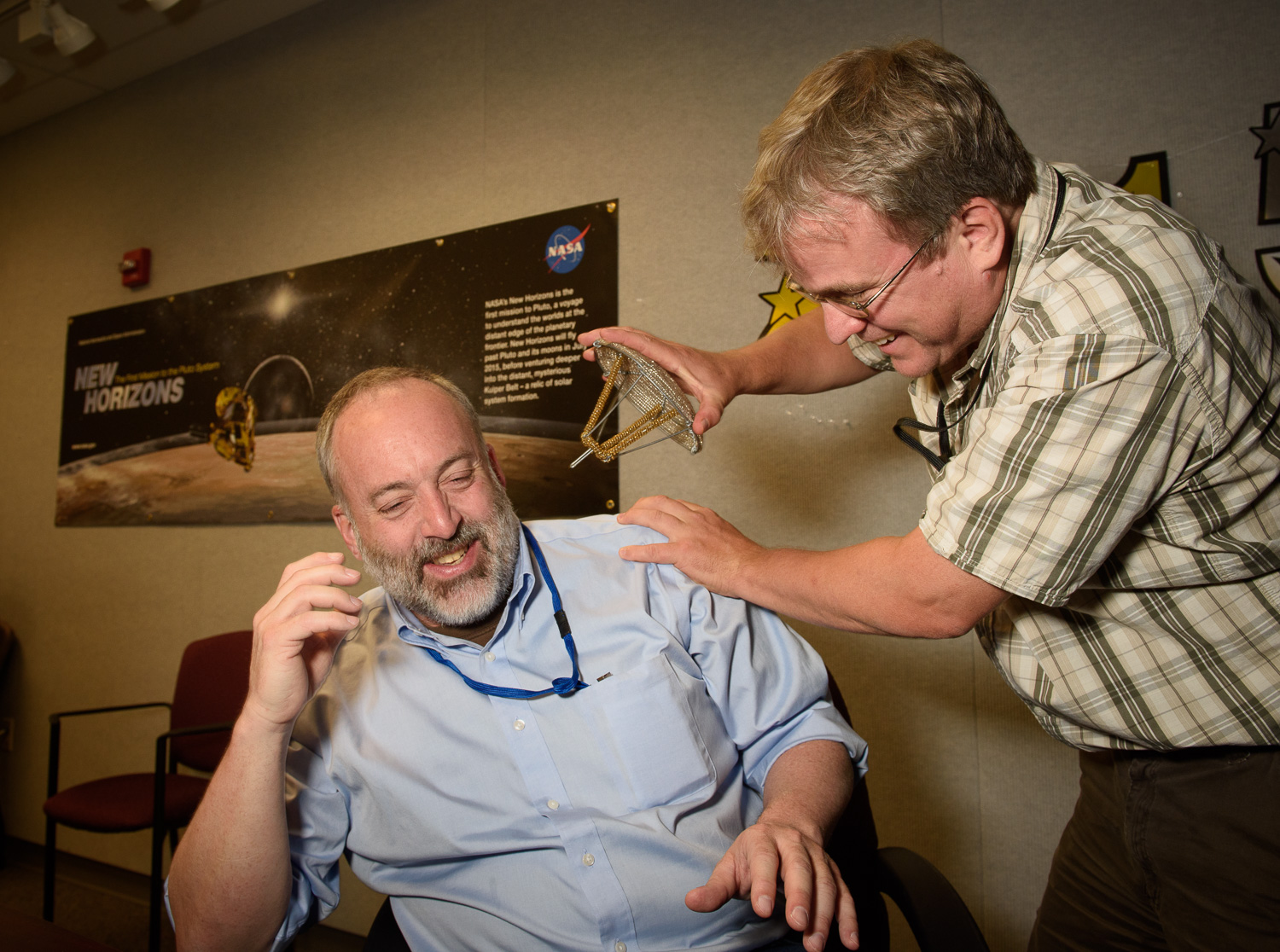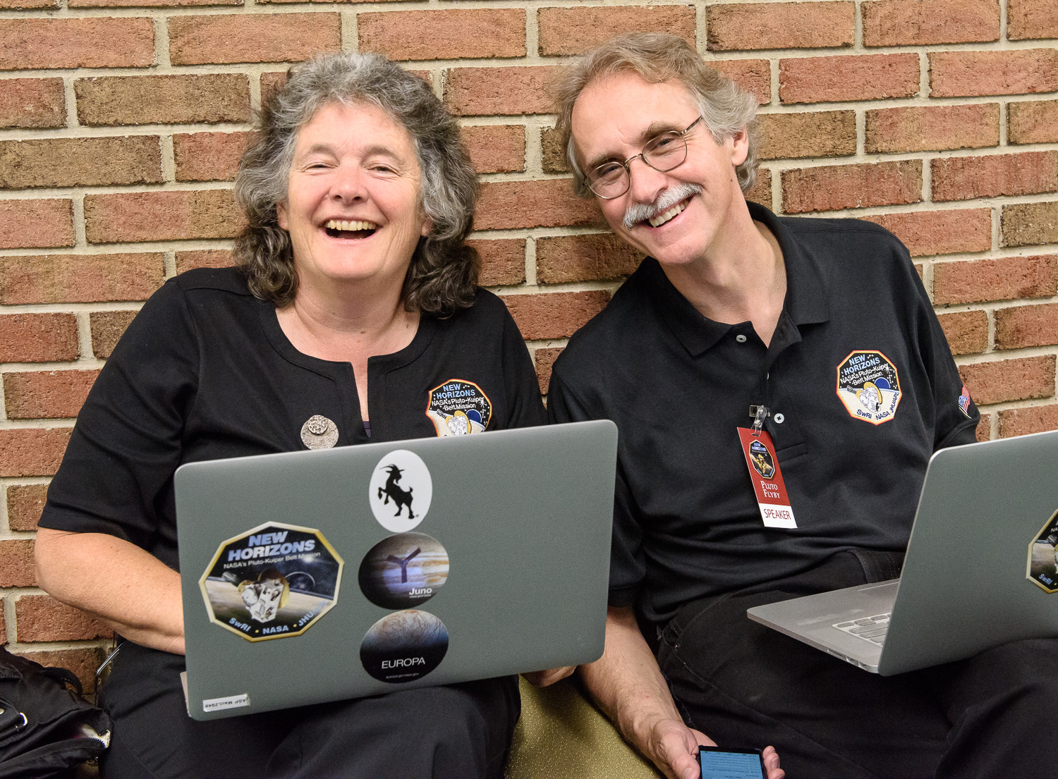 | Alice Bowman and Karl Whittenburg, sporting some really nice cheeshead-styled New Horizons hats. |